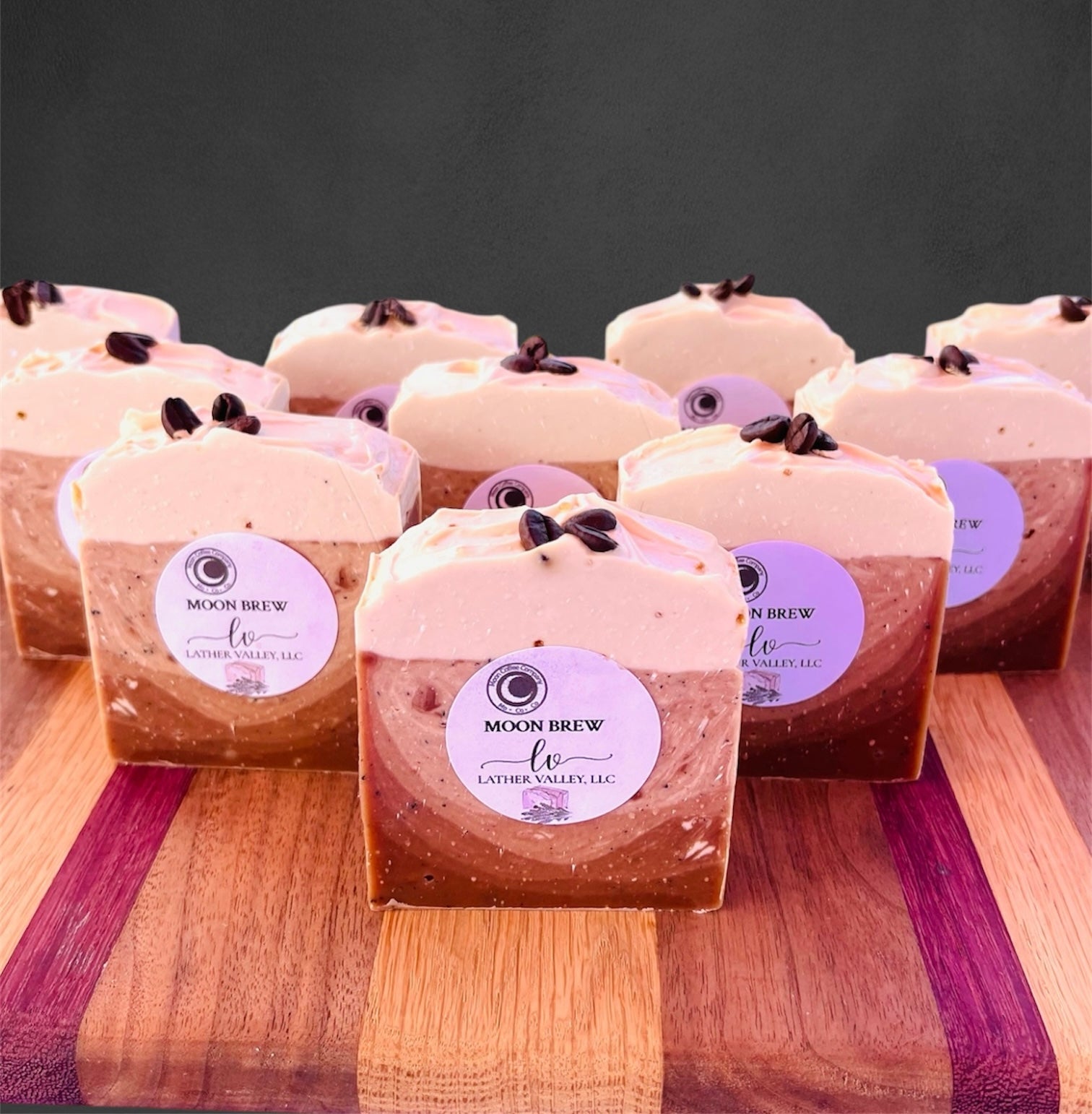 Moon Brew scrub soap features luxurious Moon Coffee Company in 3 forms! Brewed coffee, ground coffee and coffee beans with olive oil elevate your lathering experience to new heights!